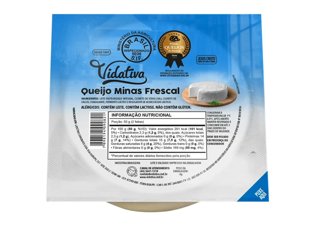 Queijo Minas Padrão DESCRIÇÃO O Queijo Minas Padrão VIDATIVA é obtido de leitepasteurizado padronizado, através da coagulaçãodo leite por meio de enzimas coagulantesapropriadas. É elaborado obedecendo aoscritérios de Boas Práticas de Fabricação (BPF) eProcedimento Padrão de Higiene Operacional(PPHO). Possui uma consistência semidura emanteigosa, cor branco creme, odor suave,característico, e muito agradável. Ideal para o caféda […]